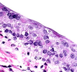 Contributor's Diagnoses and Comments: Renal tubular medullary mineralization, moderate and diffuse. Renal pelvic epithelial apoptosis with intracytoplasmic inclusions. Etiology: canine distemper virus.
