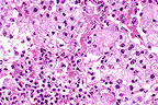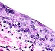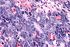 Gross Pathology: The globe was enlarged (0.5cm diameter) and protruded from the palpebral fissure. The eye was red-brown and solid. No extraocular structures appeared to be involved grossly. In one case (not the submitted case) a metastatic mass was detected in the subcutis of the neck.