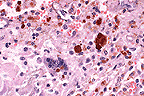 Pneumocystis carinii possesses two prominent antigens, major surface glycoprotein (MSG), and another 45-55kd molecule of unknown function. Either of these antigens is readily recognized by an immunocompetent host and stimulates both humoral and cell mediated immune responses. In the absence of an immune response however, P. carinii adheres to type I pneumocytes; this attachment may be facilitated by bridging between MSG and fibronectin. Once attached, P. carinii maintains an extracellular, intra-alveolar existence. P. carinii binds surfactant, which is thought to"hide" surface antigens and prevent recognition by the host's immune system. P. carinii pneumonia is suggested by the presence of large amounts of intra-alveolar surfactant, which appears as a foamy, eosinophilic material when stained with hematoxylin and eosin. The organisms stain with methenamine silver, periodic acid- Schiff, and Gram's stain.