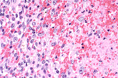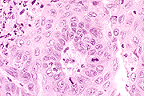 Conference Note: The lung mass is composed of polygonal cells arranged in trabeculae, nests, and papillary projections that replace the normal pulmonary architecture. The neoplastic cells have distinct cell borders and moderate amounts of eosinophilic, granular cytoplasm. The nuclei are irregularly round, vesiculate, and have 1-4 magenta nucleoli. The mitotic rate is 1 per high power field. There is extensive multifocal necrosis, neutrophilic inflammation, and keratin accumulations. Squamous cell carcinoma of the lung is believed to arise from bronchial, bronchiolar, or alveolar epithelium, or from benign keratinizing squamous cysts. Some of the conference attendees diagnosed this pulmonary tumor as bronchiolo-alveolar carcinoma. Bronchiolo-alveolar carcinomas grow on the preexisting pulmonary stroma in papillary, glandular and/or alveolar patterns and occasionally contain areas of squamous differentiation.