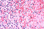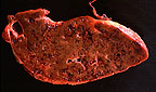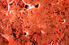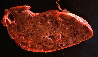 Gross Pathology: There was about 10 liters of serosanguinous fluid in the abdominal cavity and about 100ml in the pericardial sac. The capsule of the liver was covered by a thick multilayered fibrinous exudate. The liver was somewhat enlarged, with altered shape (more rounded) and firmer. The capsular surface was irregular and the cut surface had multiple linear hemorrhagic tracts on cross section.