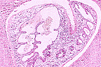 Some sections contain trematode eggs indicating that adults as well as larvae were present in the liver. The presence of adults explains the varying stages of infection noted histologically, which range from acute necrosis caused by larval migration to chronic inflammation and fibrosis.