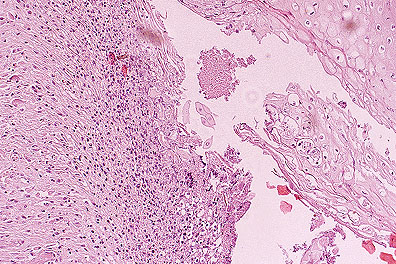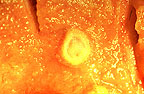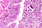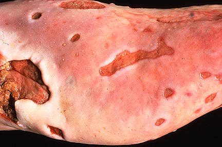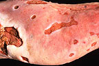 Gross Pathology: At necropsy there were numerous confluent ulcerative skin erosions (photo) over the entire body. Papular lesions up to 2.5 cm in diameter were also present but less frequently. The nails and solar epidermis were completely absent on all four legs. Similar lesions were detected on the mucosa of the trunk, the tongue (photo), the larynx and the esophagus. In the proximal great colon there was an ulcer, 30 cm in diameter, with focal chronic fibroblastic peritonitis. In the remaining colon numerous ulcers up to 1 cm in diameter were found. The mesenteric lymph nodes were necrotic.