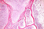 Gross Pathology: An immature male green iguana in fair body condition weighing approximately 70 gm was presented for necropsy. Both femurs were markedly enlarged in diameter and there was a pathologic fracture of the distal right femur. Both femurs cut easily with a scalpel blade. The mandible was rubbery and bent easily without breaking. Approximately 3.0 mls of serous fluid was present in the abdominal cavity. The thyroid glands were mildly enlarged but the parathyroid glands were not observed grossly. No other significant gross changes were observed in the carcass.