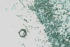 Aspergillus spp. are ubiquitous saprophytic molds. Hyphae of Aspergillus spp. are 3 to 6 æm in width, are septate, have parallel walls, and demonstrate dichotomous branching. The conidial heads are distinctive and are composed of a terminal vesicle with one or two layers of phialides which produce chains of conidia, (also called conidiospores), from their tips. The vesicle merges at its base with a conidiophore (the section of hyphae that supports the conidial head).