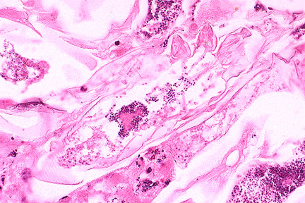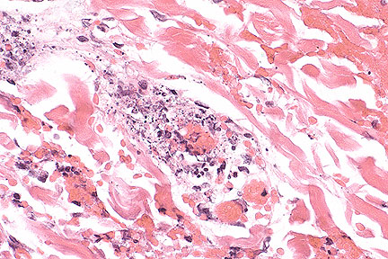 Gross Pathology: Necropsy examination of the affected pigs showed acute fibrinosuppurative bronchopneumonia and pleuritis. Most of the affected pigs had dark reddish-blue discoloration of the ear margins along with multiple 1 to 3 cm well demarcated dark reddish-blue cutaneous lesions distributed mainly along the ventral and lateral thorax and abdomen. Thoracic and abdominal cavities often contained turbid yellow fluid and strands of fibrin. Joints often contained similar appearing fluid. The spleens were enlarged and meaty.