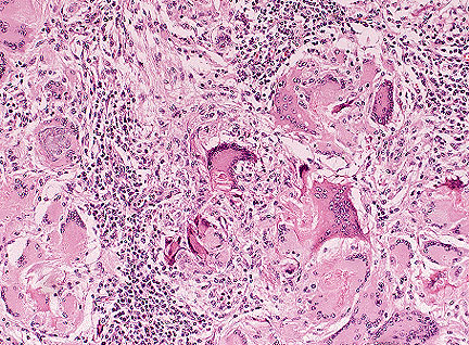 Demodectic mites are normal inhabitants of hair follicles or sebaceous glands of domestic animals and humans. Demodectic mange in cattle occurs worldwide and is produced by 3 Demodex species: D. bovis, D. ghanensis and one unnamed parasite. Gross lesions are characterized by multiple cutaneous nodules containing thick waxy material. The masses may rupture, producing an abscess or a granuloma within the skin. Histologically, the nodules represent follicular cysts that contain numerous demodex mites and keratin. Perforation or rupture of the follicular cyst can produce a severe focal granulomatous inflammatory reaction containing degenerating and mineralized segments of parasites rimmed by numerous lymphocytes, plasma cells, eosinophils, epithelioid cells and multinucleated giant cells.