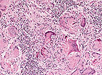 Gross Pathology: The skin was crusty and thickened with white granular flaky areas on the back, abdomen, axilla and inguinal regions. The axillary lymph nodes were enlarged.