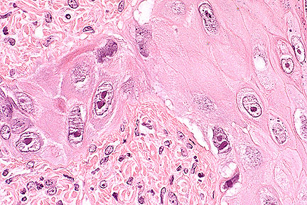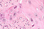 Conference Note: The diagnosis of squamous cell carcinoma in situ is based on the significant degree of atypia of the epidermal and follicular epithelial cells, the presence of increased numbers of mitotic figures some of which are bizarre, anisokaryosis, anisocytosis, and multiple, irregularly shaped nucleoli. Neoplastic epidermal/follicular epithelial cells do not breech the basement membrane zone.