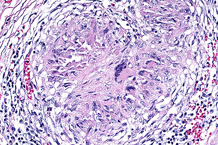 Histopathology: In sections of kidney, there was severe diffuse granulomatous interstitial nephritis with marked infiltrations of multinucleated giant cells, macrophages, plasma cells, lymphocytes and lesser numbers of neutrophils. There was also mild to moderate fibrous connective tissue proliferation. Occasionally, cores of caseous necrosis were present within granulomas. There was also circumferential or segmental vasculitis with granulomatous exudate extending into the walls of arteries and occasionally protruding intraluminally. In PAS-stained-sections there were abundant septate fungal hyphae located primarily within multinucleate giant cells. These hyphae were consistent in morphology with Aspergillus. Comparable focal or coalescing lesions were present in the heart, spleen, multiple lymph nodes, pancreas, brain stem and cervical spinal cord.