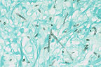 Conference Note: Aspergillus sp. are common soil saprophytes and have a worldwide distribution. Aspergillus can be differentiated from other fungi in tissue sections by the presence of thin, parallel walls, dichotomous branching, septate hyphae, and characteristic conidiophores. These structures are best demonstrated with staining by the periodic acid Schiff procedure or silver stains.
