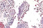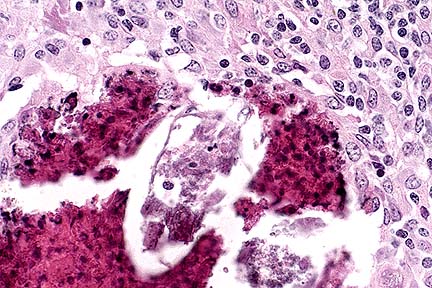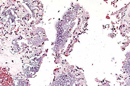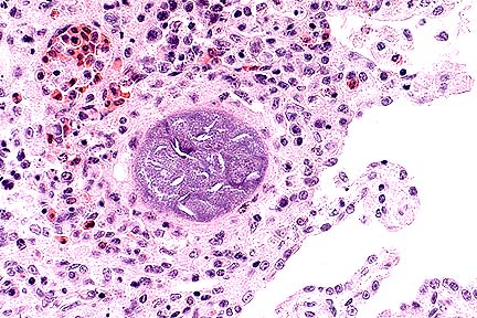 Grossly, the chorioallantois is thickened by amber, fibrin-containing fluid. Portions of the caruncle may remain adherent to the cotyledon. Histologically, there is mineralization of the trophoblast cells, interstitium of the villi, and chorioallantoic arcade. The villi are often expanded by large numbers of Salmonella, and, in some villi, neutrophils. Dilated capillaries, immediately under the sloughed trophoblast cells in the arcade zone, are expanded by bacteria and resemble large rounded trophoblast cells filled with bacteria. The fetus is often free of lesions; however, bacteria may occasionally be found colonizing the airway epithelium. Suppurative hepatitis has also been reported in fetuses from Salmonella-induced abortions.