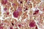 The principle clinical effect of Leucocytozoon infection is an intravascular hemolytic anemia, a result of both the mechanical destruction of erythrocytes by the protozoa and protozoal production of an antierythrocytic factor. Gross lesions include hepatomegaly, splenomegaly, pulmonary congestion, and pericardial effusion. Megaloschizonts appear as grey-white nodules in the heart, liver, lung, or spleen. Histologically, there is ischemic necrosis and associated inflammation in the heart, brain, spleen, and liver due to occulsion of blood vessels by megaloschizonts in endothelial cells. In addition, ruptured schizonts may induce granulomatous reactions in the surrounding tissues.