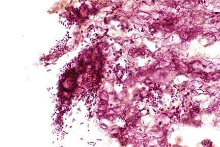 The presence of massive numbers of organisms in trophoblasts in an ovine placenta is highly suggestive of Coxiella infection. However, Coxiella is typically restricted to the trophoblasts and does not invade deeper placental tissues. Further query of the owner revealed that the sheep were housed in a barn that formerly housed turkeys, a possible source of the Salmonella. Salmonella arizonae can be recovered from the small and/or large intestine of sheep in the absence of intestinal lesions (1), and these sheep may have been carriers of the organism.