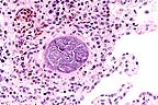 Histologically, lesions consist of a highly vascular granulation tissue with neutrophils and other inflammatory cells at the periphery and central aggregates of eosinophils. If larvae or larval remnants are present, they are surrounded by epithelioid macrophages, multinucleate giant cells, eosinophils, lymphocytes, and plasma cells (eosinophilic granulomas).