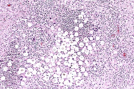Histologically, the lesion is described as having a "soap-bubble" appearance, the result of the thick, nonstaining, capsule. The inflammatory response to cryptococcosis is usually minimal, consisting of macrophages, lymphocytes, and plasma cells. Occasionally, a granulomatous reaction will develop, especially in the lungs.
