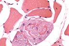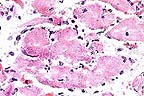 Periodic acid-Schiff (PAS) staining for glycogen reveals large granular aggregates of glycogen within many fibers and strong positive staining of the more organized aggregates visible on hematoxylin and eosin (H&E) stained sections. Following amylase digestion, the granular aggregates are largely amylase-sensitive, whereas the more organized aggregates are generally amylase-insensitive. Many macrophages contain PAS-positive material which is partially amylase-sensitive.