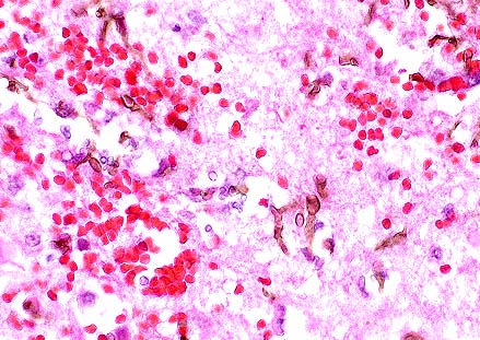Impression cytology of the brain lesion revealed high numbers of RBC's, neutrophils, and macrophages with occasional lymphocytes. Numerous brown septate branching fungal hyphae were also present.
