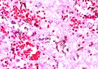 History: This was a wild born meerkat that had been in captivity for more than 9 years. During this time, no significant clinical signs were noted until 4 days before the animal's death when it was noted to be lethargic and continuously vocalizing. Attempts to catch it at that time were unsuccessful. The next day, circling and ataxia were present and the animal was brought to the veterinary hospital at the National Zoo for examination. A blood sample collected at this time revealed mild anemia (PCV = 35.5%; normal 39 - 49%) but all other hematologic and serum biochemical results were within normal ranges. Whole body radiographs were also unremarkable. The meerkat was administered chloramphenicol subcutaneously but by the next morning the ataxia had worsened and the animal was depressed. Thiamin, lactated Ringer's solution, and fluconazole were added to the therapy regimen. The animal's condition continued to deteriorate over the next 36 hours and it was found dead on the morning of the fifth day.