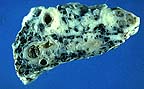Gross Pathology: A formalin-fixed bovine pancreas was sent to our laboratory for histopathologic examination. No necropsy description was provided. The pancreas was markedly firm, had a thickened white capsule and an irregular capsular surface. At the cut surface (Kodachrome), there were multiple cystic (dilated) ducts with thickened fibrous walls which were packed with leaf-shaped trematodes. Multiple round brown to black areas were also seen. Normal parenchyma was obscured by these changes.