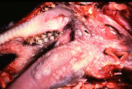 Gross Pathology: Postmortem findings included extensive oral erosions and a generalized pneumonia consisting of multifocal consolidation most prominent in the ventral areas.