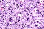 Essential microscopic features are those of a circumscribed, non-encapsulated, multi-lobulated, nodular mass effacing the gland. Lobules are composed of a uniform population of cells forming densely cellular sheets and thick cords which surround multiple, variably-sized spaces that are either empty or contain variable amounts of blood and/or fibrin, proteinaceous secretory material and degenerate cells. In some areas, the cells form poorly-defined tubular structures. Cells are polygonal with indistinct margins, abundant eosinophilic cytoplasm and oval to round nuclei with clumped chromatin and occasionally 1-2 prominent nucleoli. Mitotic figures number 6 to 12 per HPF. Focal areas of necrosis occur within lobules.