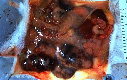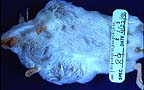 Gross Pathology: The animal had good internal fat reserves. The only gross finding consisted of multiple small white nodules within the liver, many of them surrounded by a thin zone of hemorrhage.