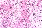 Histopathology: The liver had multifocal to coalescing non-encapsulated areas of eosinophilic and amorphous material admixed with cellular debris (caseous necrosis) with minimal inflammatory reaction. There were numerous colonies of gram-negative filamentous bacteria and occasional cocci in the periphery of the necrotic areas. The adjacent sinusoids contained lymphocytes and neutrophils and sinusoidal cells were prominent. Occasionally (not in all slides), there were necrotic foci adjacent to veins (mainly central veins) and there was focal disruption of the vein wall with invasion of filamentous organisms into the vessel lumen and fibrin thrombi. Electron microscopy of the liver lesions demonstrated numerous, 1-2.5 m in length, rods with morphology characteristic of gram-negative bacteria and straight or blunt borders. The organisms were located both within hepatocytes and free in the interstitium.