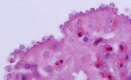 The cryptosporidial organism attaches to the glycocalyx of the epithelial cell. The location is often described as intracellular but extracytoplasmic. The organism is surrounded by a membrane of host origin. At the interface between the parasite and the host epithelial cell is an attachment zone containing a specialized feeder organelle. Macrogametes are characterized ultrastructurally by the presence of dark staining polysaccharide granules.