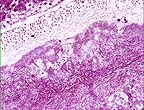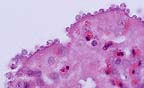 Multiple sections of the bursa of Fabricius were submitted. Moderate diffuse intraepithelial and superficial subepithelial accumulations of heterophils were evident. Mild acute lymphoid necrosis was noted within many of the bursal lymphoid follicles. Occasional intraepithelial cystic structures, many containing amorphous basophilic material and cellular debris, were also noted within the sections. Mild lymphoid depletion was also evident. Numerous round to ovoid basophilic structures measuring approximately 4-6 m, in diameter were noted adherent to the mucosal surfaces of the tissues.