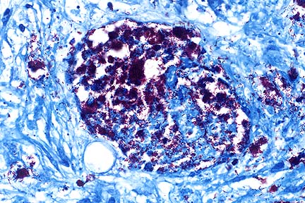 In most mammals, MAIC infections are characterized by a diffuse granulomatous, inflammatory reaction characterized by large numbers of macrophages filled with numerous intracytoplasmic bacilli without necrosis, fibrosis, or calcification. Multinucleate giant cells of the Langhans type are often present. There is usually little lymphocytic response. Lesions are usually multifocal and coalescing or diffuse. Regional lymph nodes are typically involved and infection may become generalized via the hematogenous route. In this case, emboli of necrotic material and bacteria were noted within vascular structures.