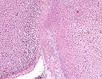 Gross Pathology: The carcass was thin. The liver was enlarged and had multiple, well demarcated to coalescing, 2 to 10 mm diameter, yellowish foci with a caseous consistency throughout the parenchyma. On cut section, the wall of the rumen had a 5 x 7 cm thickened area with a yellowish-red and dry appearance and was very friable. Segments of the omentum were attached to the serosal surface of the rumen in the affected areas. No other gross lesion were observed.