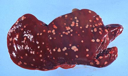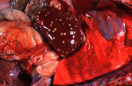 The factors which contribute to the pathogenicity of Fusobacterium necrophorum include a potent endotoxin, a polysaccharide capsule, an exotoxin (leukocidin) and a hemolysin. It is postulated that the leukocidin allows the organism to withstand the phagocyte response and enables the infection to persist. In most instances, infection is minor and produces no clinical signs; with sufficient hepatic involvement, endotoxemia develops, causing an acute or chronic illness. Hematogenous spread from hepatic foci, including rupture into the caudal vena cava, may result in disseminated infection and rapid death.
