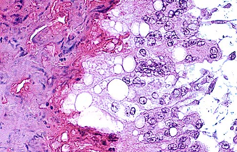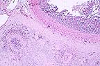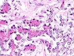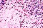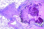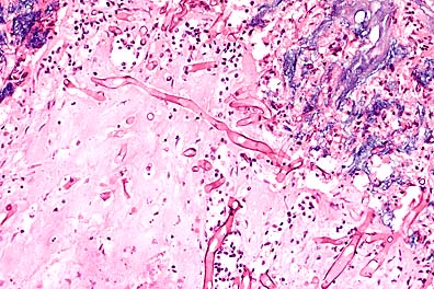 Conference Note: The inclusions in submitted tissues are eosinophilic to amphophilic, range up to 10 microns in diameter, and did not appear to be associated with degenerative or inflammatory changes. The morphologic features of the fungus are consistent with the those of the Class Zygomycetes and not with Aspergillus or Trichosporon spp. These features include broad, thin-walled, infrequently septate, pleomorphic hyphae that range from about 5 to 20 m in width and irrgeular right angle branches. The fact that the hyphae stain well with H&E is also characteristic of a zygomycete.