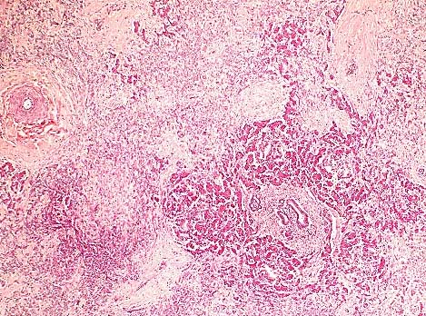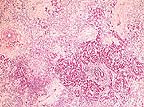 The section consisted of multiple lobular structures. Dense to myxomatous connective tissue separated individual lobules. A loose lipid and vacuolated reticular fibrinous material within which were numerous multinucleated giant cells and occasional macrophages formed the periphery of lobules. Forming zones within lobules were polygonal to ovoid macrophages, most with vacuolated or membrane-bound lipid droplets. Eosinophilic amorphous necrotic follicles and epithelial-like central ribbons with empty interiors usually overlay "foamy" macrophage accumulations.