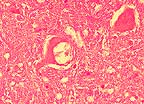 The pulmonary lesions are quite characteristic, usually being in the form of 1-10 mm diameter nodules, which represents nests of eggs and larvae. These nodules are yellowish and firm, scattered throughout the parenchyma but more common in the peripheral lung. A small amount of creamy exudate can be expressed from each nodule. Severe, confluent consolidation can produce clinical signs of chronic coughing and weight loss. Histologic lesions include dense collections of mononuclear cells, and occasional giant cells especially around degenerate larvae. There is often bronchiolar smooth muscle hyperplasia, catarrhal and eosinophilic bronchiolitis, hyperplasia of submucosal glands and smooth muscle hypertrophy and hyperplasia within pulmonary arterial walls. The granulomatous alveolitis and catarrhal bronchiolitis gradually regresses. However, the hypertrophy and hyperplasia of the smooth muscle in arteries, bronchioles and alveolar ducts persists.