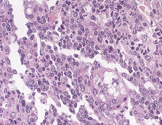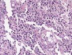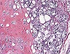 Microscopically, chordomas of ferrets are described as infiltrative, multilobulated masses with each lobule composed of three components: closely packed vacuolated (physaliferous) cells, cartilage, and bone. The three components are often arranged concentrically, with physaliferous cells surrounding cartilage with a central core of bone. Physaliferous cells contain abundant amphophilic, foamy cytoplasm, and ahve round to oval nuclei. Mitoses are rare. The physaliferous cells are supported by a mucinous matrix of variable thickness that blends gradually with mature cartilage and bone. The bone often contains marrow. Immunohistochemically, physaliferous cells stain strongly positive for both vimentin and keratin, and weakly positive for S-100 protein and neuron specific enolase. Only in ferrets do chordomas contain bone.