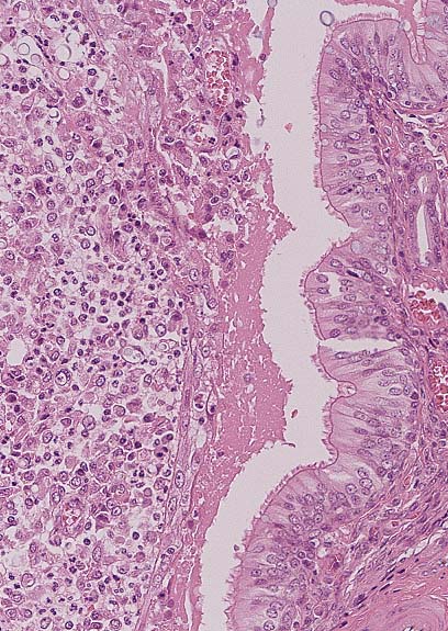 History: The dog was presented to a veterinarian with enlarged mandibular lymph nodes but good general condition. In the following weeks a progressing lameness of the right forelimb was observed. On X-ray, there was a periosteal reaction at the right carpus. Antiphlogistic and antibacterial treatment were without success. During the next days, the dog developed elevated body temperature (39-40 C) and became increasingly apathetic and cachectic. A mass (1 cm in diameter) at the upper right canine, extending into the nasal cavity and the dorsum nasi, was noticed. An aspirate from this mass was examined cytologically, and an infection with Cryptococcus neoformans was suspected. The dog was submitted to a small animal clinic for further treatment. The clinic confirmed the diagnosis of the local veterinarian. Additionally, a mild exophthalmus and strabismus divergens of the left eye was noticed. After ophthalmologic examination, a granulomatous chorioretinitis was suspected. By ultrasound investigation, a mass in the left orbita with lysis of the adjacent bone was observed. The dog was euthanized because of poor prognosis.