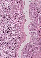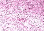 Gross Pathology: At necropsy, yellowish, soft masses were seen throughout the whole nasal cavity extending from the conchae to the ethmoid bone, infiltrating the dorsum nasi, the palatum durum, the left orbita and left side of the sinus frontalis where gelatinous, white masses were seen. Similar masses were noticed at the optic chiasma. The macroscopic examination of the eyes revealed several white foci in the fundic region. Multifocally, the retina had a greyish appearance. At the right distal radius a yellowish mass (several cm in diameter) was noticed, destroying the compacta and extending into the medullary cavity. Both mandibular lymph nodes were enlarged. The cut surface of the spleen had numerous white glassy foci of several millimeter in diameter.
