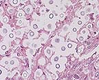 Conference Note: Participants agreed that the morphology of the budding yeast is consistent with Cryptococcus neoformans. In H&E stained sections, C. neoformans appears thin-walled, slightly basophilic and spherical, with single narrow-based buds. The fungus is surrounded by a wide clear zone; the shrunken capsular material stains positively with mucicarmine and the fungal wall stains with PAS. In some sections, scattered foci of osteonecrosis of the turbinates were noted.