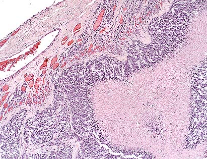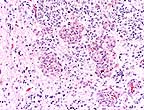 Conference Note: This case has classic features of glioblastoma multiforme, which is often simply called high grade astrocytoma. These features include high cellularity, pleomorphism, necrosis, subpial spread, cortical infiltration, necrosis surrounded by "pseudopalisades" and areas of glomerulus-like endothelial proliferation. Recent evidence suggests that vascular endothelial cell growth factor (VEGF) is secreted by malignant astrocytes perhaps in response to hypoxia.