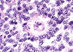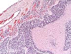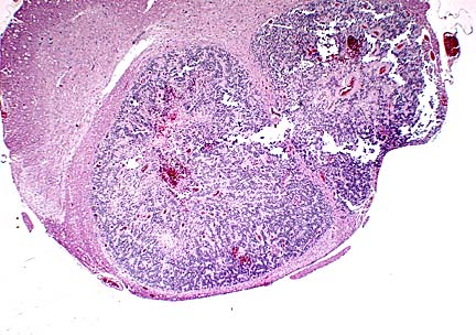 This spinal cord neoplasm presented a diagnostic challenge for our pathology group. Use of this recently-introduced Wistar-derived strain for carcinogenicity studies has not been reported. References to spinal cord tumors in other rat strains are brief and infrequent, and the occurrence of spinal cord neoplasms is extremely rare in our extensive experience with Sprague-Dawley rats. The cells of this neoplasm are forming pseudorosettes and cords in some areas, however, the cells are quite pleomorphic, true rosette formation is not evident, and cell margins are often distinct. Depending on the section, the participant may see a single well-delineated mass, or two masses separated by a fibrous stroma that represent branching by the main tumor. Mitotic activity is very high, and clusters and cords of cells are often surrounded by an amorphous eosinophilic matrix. Common features of other central nervous system neoplasms, such as astrocytoma, oligodendroglioma, meningioma, ependymoma, and granular cell tumor were not evident. This neoplasm may represent an extremely anaplastic variant of a glial tumor, and as such, be difficult to categorize according to classical criteria. Cytochemical studies may be contributory, but were unavailable to us.