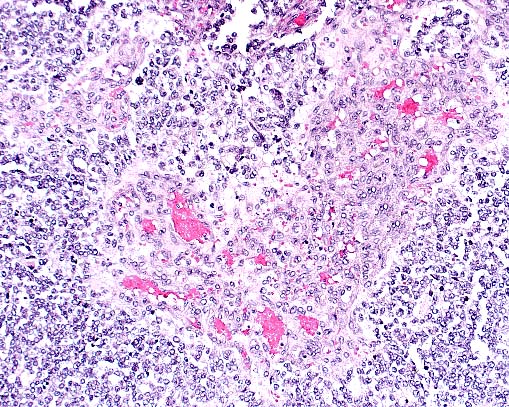 Astrocytomas generally occur as soft tissue masses in the substance of the cerebral hemispheres, and produce a spectrum of clinical signs based on their exact location. The majority of astrocytomas are well-differentiated with a relatively uniform population of transformed astrocytes having oval nuclei, little heterochromatin and poorly defined cell borders. The tumors can be graded, but regardless of grade there is a background of astrocytic processes between neoplastic nuclei. Higher grade astrocytomas are characterized by increasing nuclear anaplasia, mitotic activity and vascular proliferation. In the adjacent parenchyma, endothelial cells may form glomeruloid proliferations within vascular lumina. These are prominent in high grade astrocytomas, and were present in this case. The highest grade astrocytomas are usually very cellular, and have a mixture of firm white areas, and softer yellow foci of necrosis. These latter features, especially the presence of necrosis, have given rise to the term glioblastoma multiforme. Immunohistochemistry performed by AFIP was positive for glial fibrillary acidic protein (GFAP) and negative for S100, synaptophysin, cytokeratin, and vimentin.