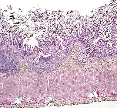 The histologic changes in the colon (epithelial necrosis, epithelial syncytial cells and intranuclear inclusion bodies) are consistent with infection with a paramyxovirus. A careful microscopic search of multiple organs, including spleen, liver, lymph nodes and lung failed to demonstrate involvement of any other organ. Callitrichids are susceptible to parainfluenza virus, measles (morbillivirus) virus, and Paramyxovirus saguinus. Parainfluenza is characterized clinically by upper and lower respiratory tract disease. Measles in New World primates can manifest as a respiratory tract disease or an enteritis. Paramyxovirus saguinus is reported to cause gastroenteritis in marmosets and tamarins.