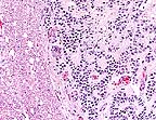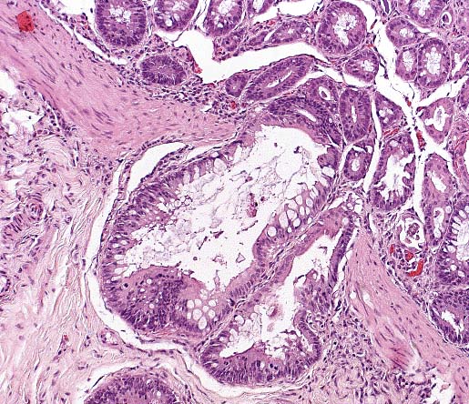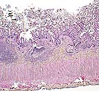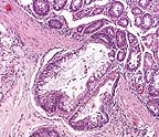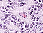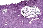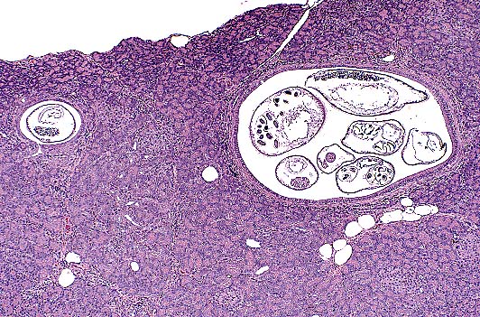 Marked variation is present in the severity of lesions between affected animals. Lesions consist of the following: Multifocally, pancreatic ducts are greatly dilated and contain numerous parasites. The parasites are round, approximately 125 to 150 in diameter, have a ridged cuticle, a pseudocoelom and contain tubular organs (nematode). Numerous embryonated ova are present in the uterus of female parasites. Ductular epithelium is multifocally attenuated and periductal tissue is fibrotic and hypercellular. The cellular infiltrate is composed primarily of lymphocytes with fewer eosinophils. The cellular fibrous tissue extends into exocrine tissue where there is loss of acinar tissue. The morphology and intraductal location of the nematodes are most suggestive Trichospirura leptostoma infection.