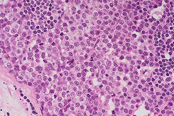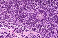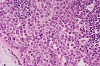 Ultrastructural findings: Maximum diameter of the tumor cells approximately 10 micrometers. The nuclei are either round or oval or irregularly shaped and indented, with coarse heterochromatin and a small nucleolus. Numerous mitochondria and poorly developed rER and Golgi complex. Numerous membrane- bound electron-dense bodies of up to 1.4 micrometer in diameter and small numbers of multivesicular bodies in the cytoplasm. Scarce matrix granules present in the cytoplasm of some cells.