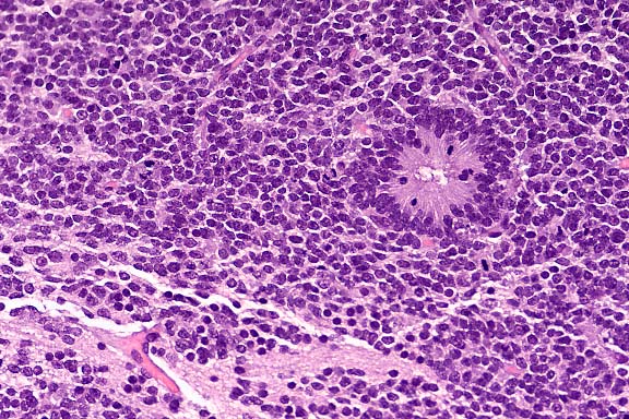Although rare in animals, medulloblastomas are the most common embryonal tumors of children and comprise 20% of all pediatric brain tumors. The histogenesis of these tumors is somewhat controversial and the target of active investigation. Originally, the neoplasm was thought to arise from a specific cell of the external granular layer of the cerebellum; however, more current theories revolve around the hypothesis that a population of multipotent progenitor cells gives rise to a number of different tumor types. These tumors are collectively called primitive neuroectodermal tumors, or PNETs, and include neuroblastomas, pineoblastomas, and retinoblastomas.