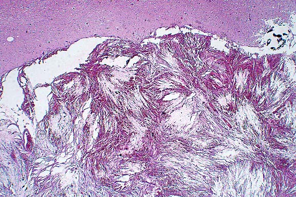All three meningeal masses have similar histology, composed of well- circumscribed proliferations of elongated spindle cells with fine cytoplasmic extensions and fibrillary processes, forming empty clefts with intervening hemorrhage. There is a slightly lobulated pattern with more plump spindle cells aggregated in a pseudolobular pattern. Little mineralization is detected but there are many accumulations of hemosiderin-laden macrophages. The masses consistently embed into and deform or atrophy the cortical gyri and, in one area, expand into a sulcus with focal infiltrations via Virchow-Robins spaces.