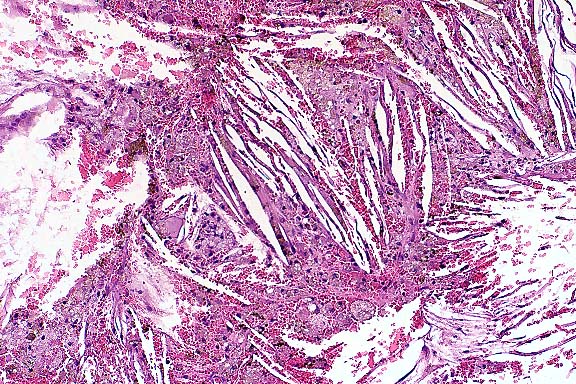 Conference Note: Although careful consideration was given to the diagnosis of meningioma, conference participants unanimously preferred the above diagnosis. The lesion is composed of numerous cholesterol clefts, admixed with pigment-laden foamy cells (histiocytes), hemorrhage, and multiple foci of mineralization. Arachnoidal cap cell hyperplasia was observed in some sections. Members of the Department of Neuropathology of the AFIP reviewed this case and believe this lesion represents a reactive process, not a meningioma.