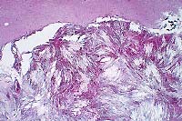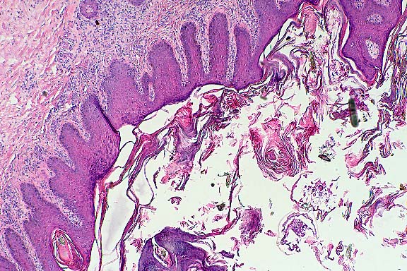 Conference Note: In some of the sections examined in conference, there were one or more cross-sections of an ectoparasite within the hyperkeratotic crust. The organism has jointed appendages with prominent setae, striated muscle, and mouth parts. This case was reviewed by Chris Gardiner, PhD, veterinary parasitology consultant to the AFIP. He confirmed that the organisms are mites but was unable to provide a more specific classification.